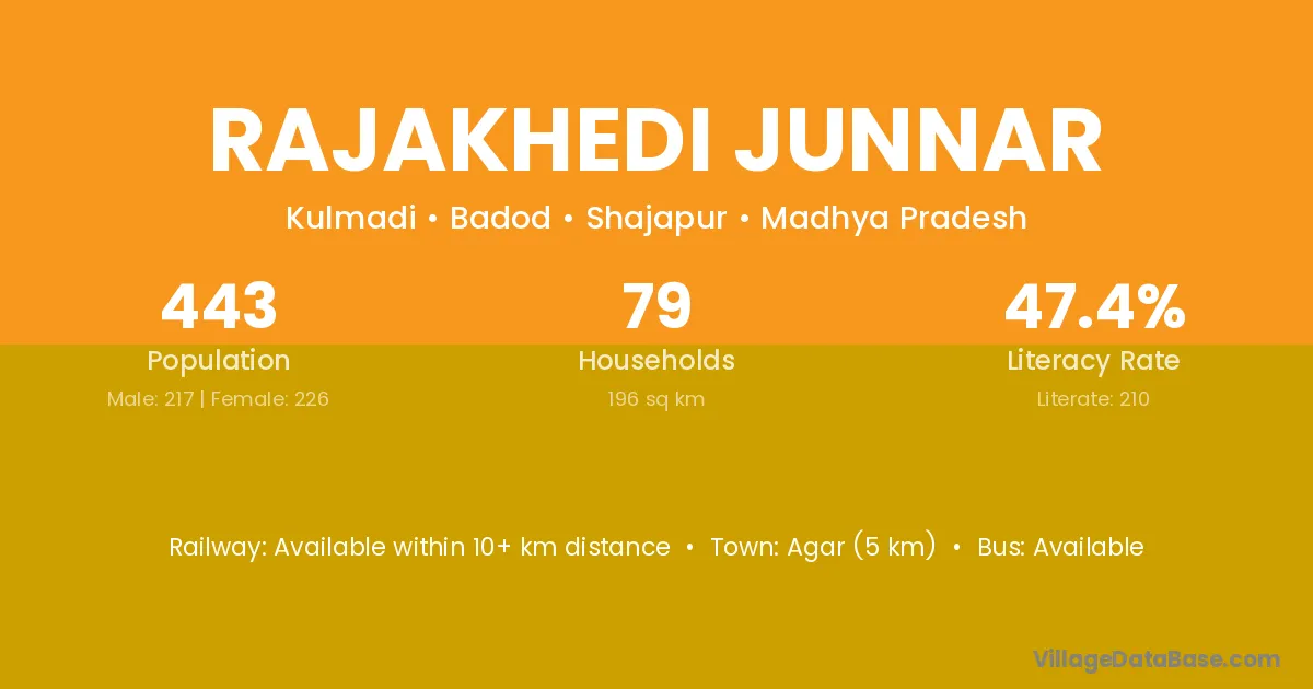 Agar (5 km) is the nearest town to Rajakhedi Junnar village for major economic activities and is located approximately 5 km away.