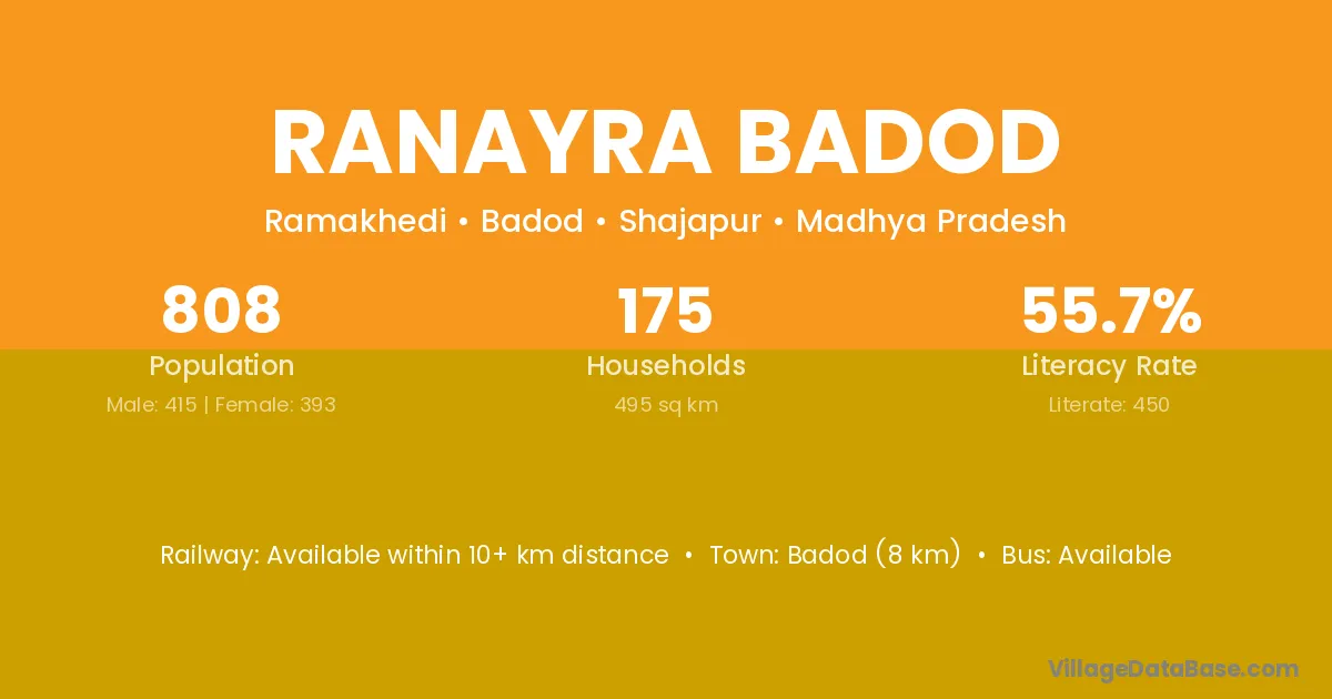 Badod (8 km) is the nearest town to Ranayra Badod village for major economic activities and is located approximately 8 km away.