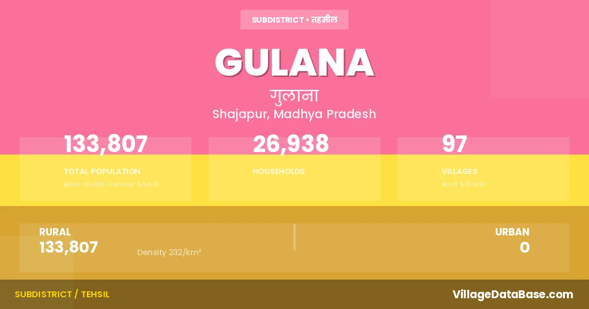 Gulana is a town and Tehsil in the Shajapur district of the Madhya Pradesh. In India, a Tehsil is a subdivision of a district responsible for the administration and revenue collection of a specific area within the district. Tehsils play a crucial role in the local governance structure, contributing significantly to the development and administration of their communities.