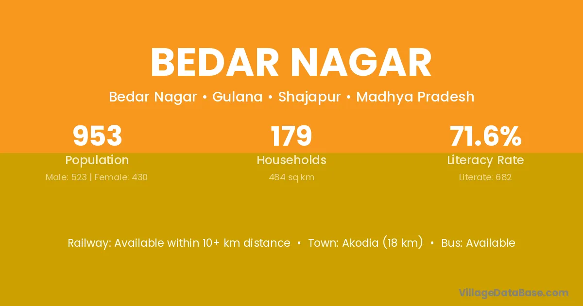 Akodia (18 km) is the nearest town to Bedar Nagar village for major economic activities and is located approximately 18 km away.