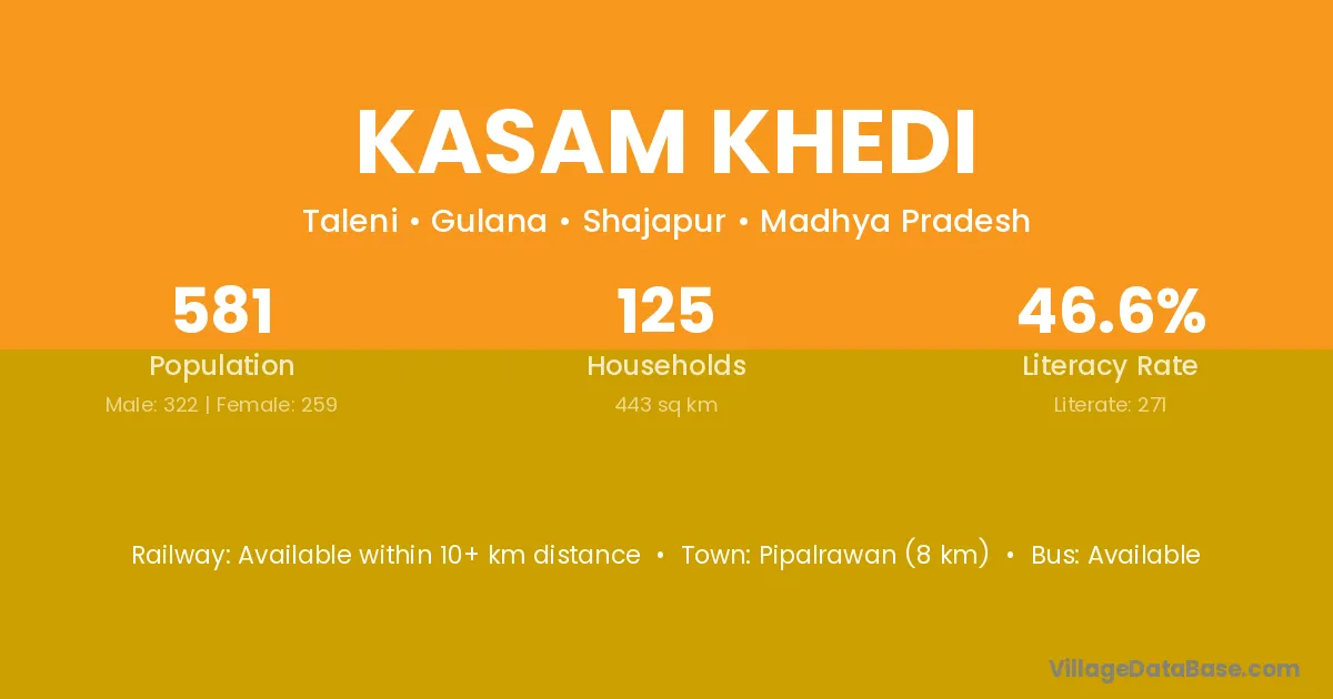 Kasam Khedi village has a total population of 581 people, of which 322 are males and 259 are females.