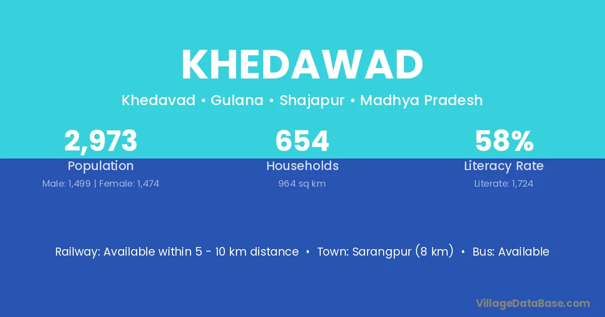 Sarangpur (8 km) is the nearest town to Khedawad village for major economic activities and is located approximately 8 km away.