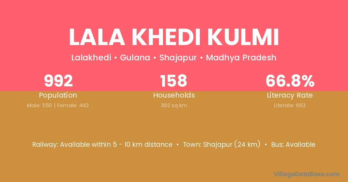 Shajapur (24 km) is the nearest town to Lala Khedi Kulmi village for major economic activities and is located approximately 24 km away.