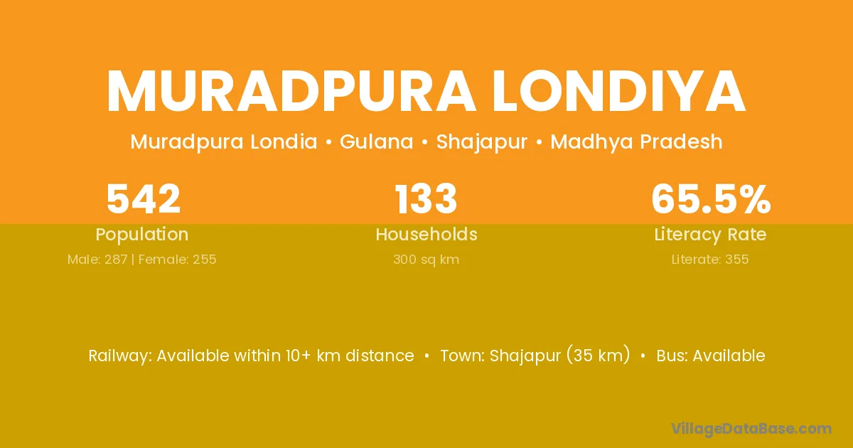 Shajapur (35 km) is the nearest town to Muradpura Londiya village for major economic activities and is located approximately 35 km away.