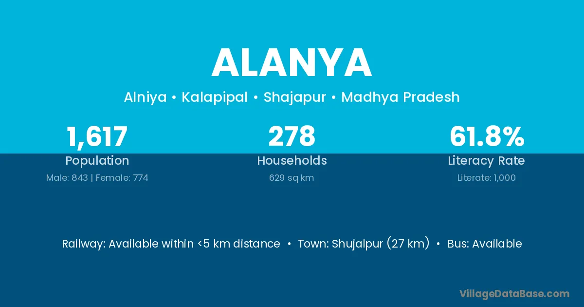 Shujalpur (27 km) is the nearest town to Alanya village for major economic activities and is located approximately 27 km away.