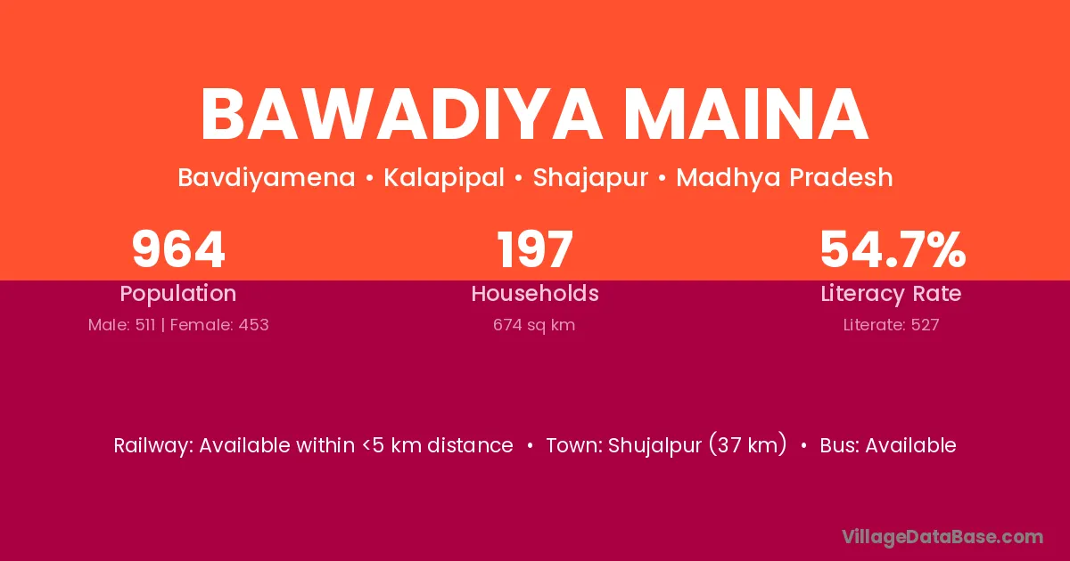 Shujalpur (37 km) is the nearest town to Bawadiya Maina village for major economic activities and is located approximately 37 km away.