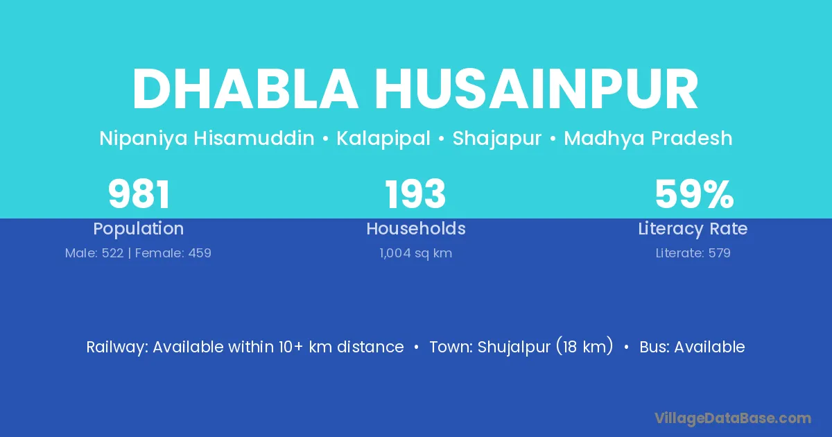 Shujalpur (18 km) is the nearest town to Dhabla Husainpur village for major economic activities and is located approximately 18 km away.