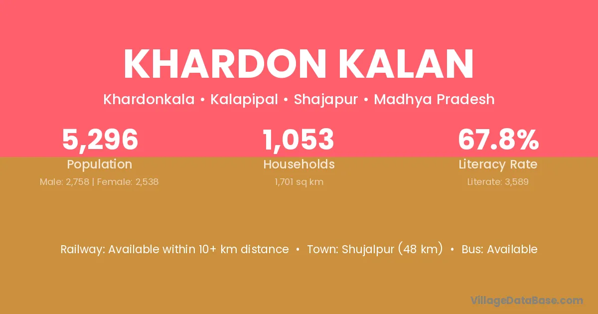 Shujalpur (48 km) is the nearest town to Khardon Kalan village for major economic activities and is located approximately 48 km away.