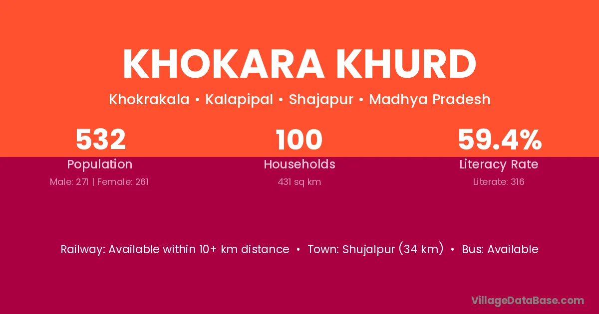 Shujalpur (34 km) is the nearest town to Khokara Khurd village for major economic activities and is located approximately 34 km away.