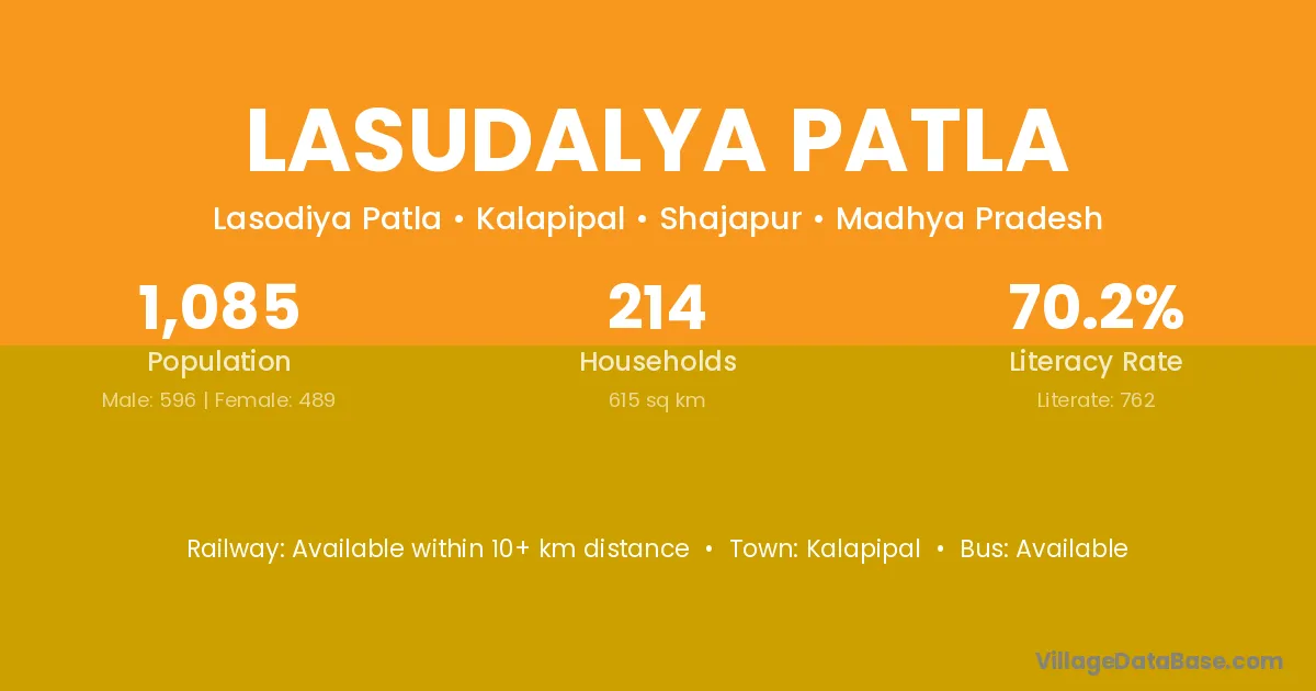 Lasudalya Patla village has a total population of 1,085 people, of which 596 are males and 489 are females.