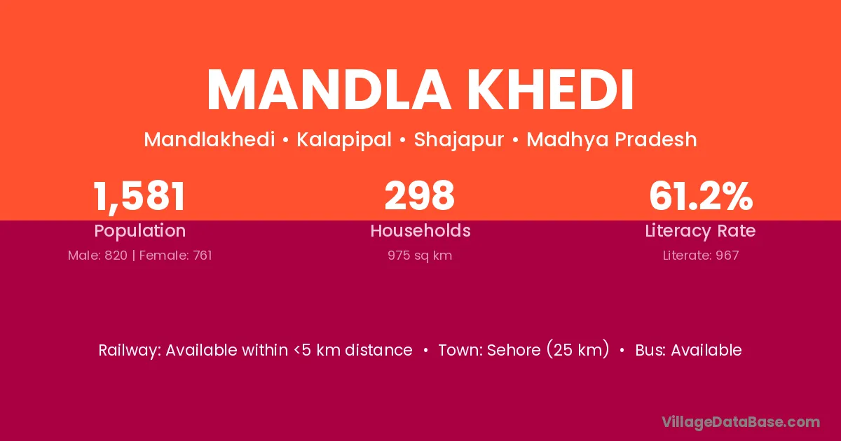 Mandla Khedi village has a total population of 1,581 people, of which 820 are males and 761 are females.