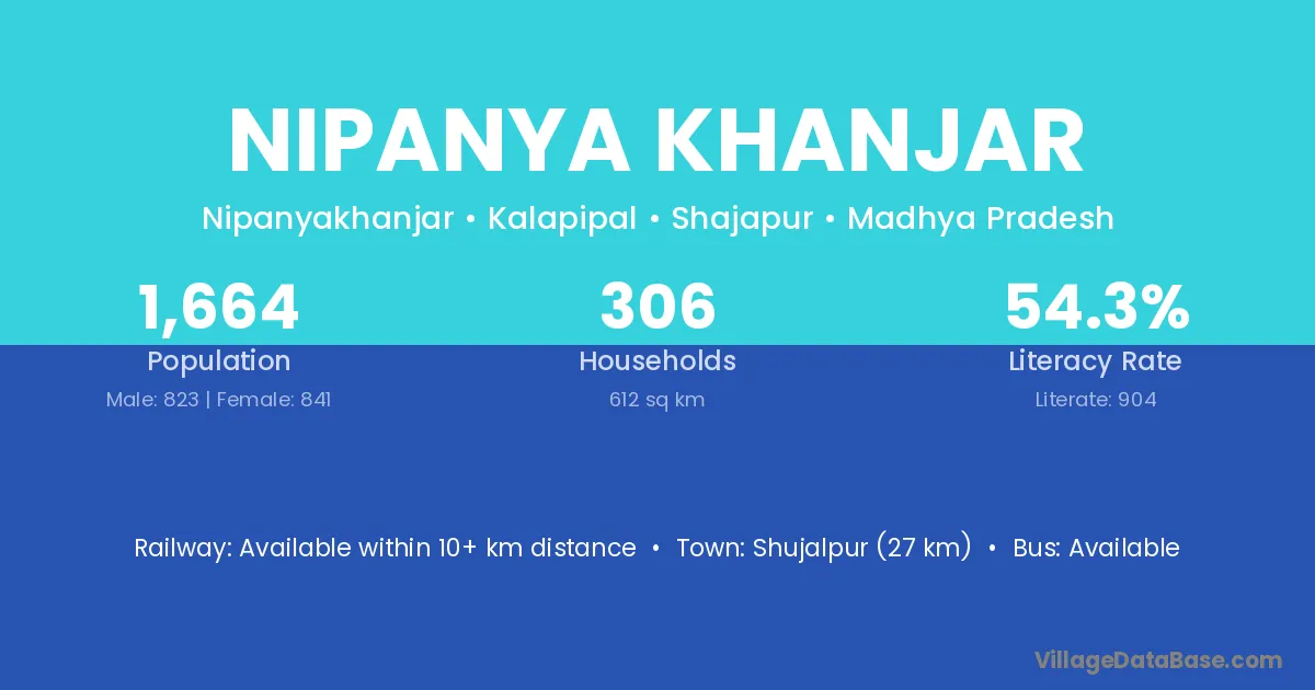 Shujalpur (27 km) is the nearest town to Nipanya Khanjar village for major economic activities and is located approximately 27 km away.