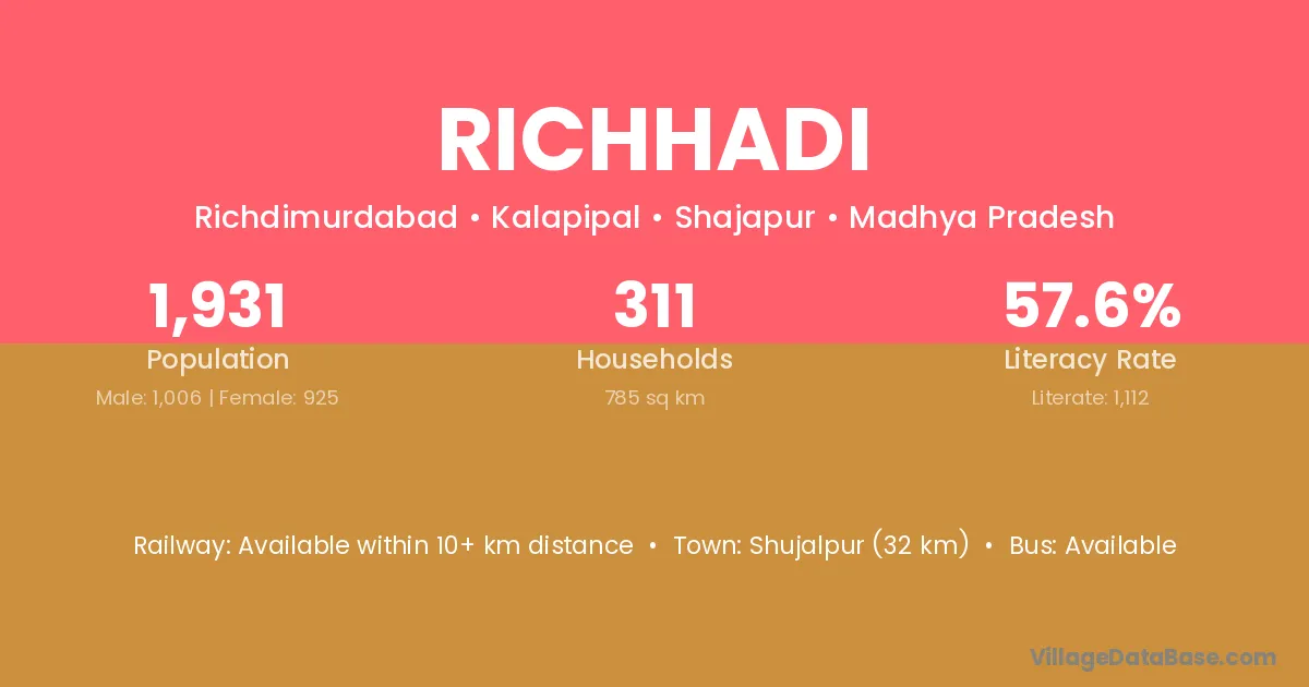 Shujalpur (32 km) is the nearest town to Richhadi village for major economic activities and is located approximately 32 km away.