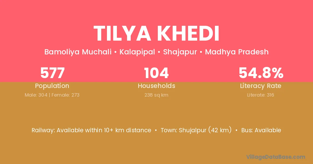 Shujalpur (42 km) is the nearest town to Tilya Khedi village for major economic activities and is located approximately 42 km away.