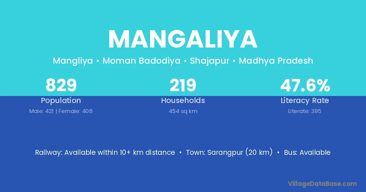 Sarangpur (20 km) is the nearest town to Mangaliya village for major economic activities and is located approximately 20 km away.