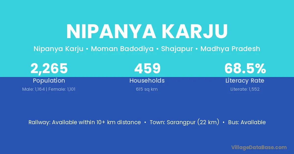 Sarangpur (22 km) is the nearest town to Nipanya Karju village for major economic activities and is located approximately 22 km away.