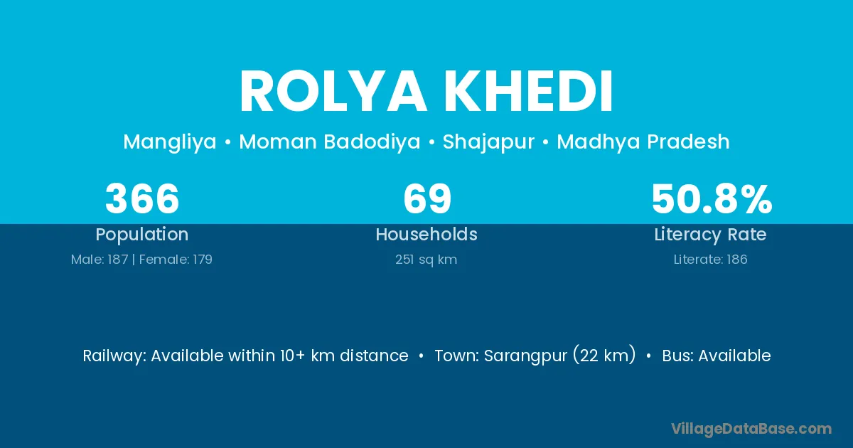 Rolya Khedi village has a total population of 366 people, of which 187 are males and 179 are females.