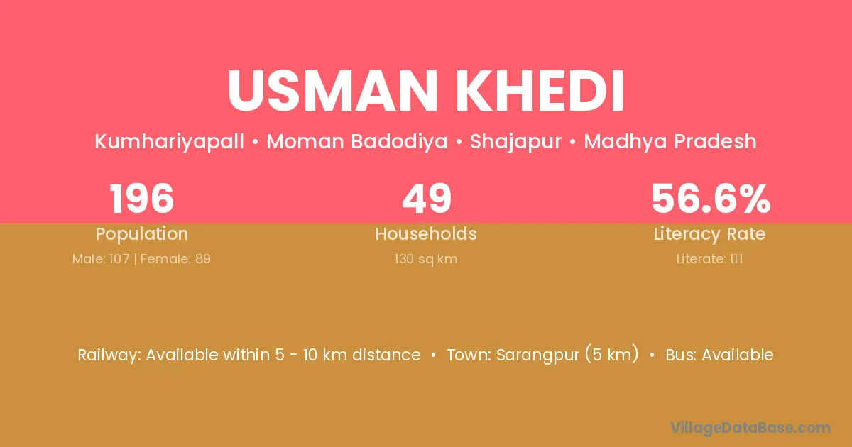 Sarangpur (5 km) is the nearest town to Usman Khedi village for major economic activities and is located approximately 5 km away.