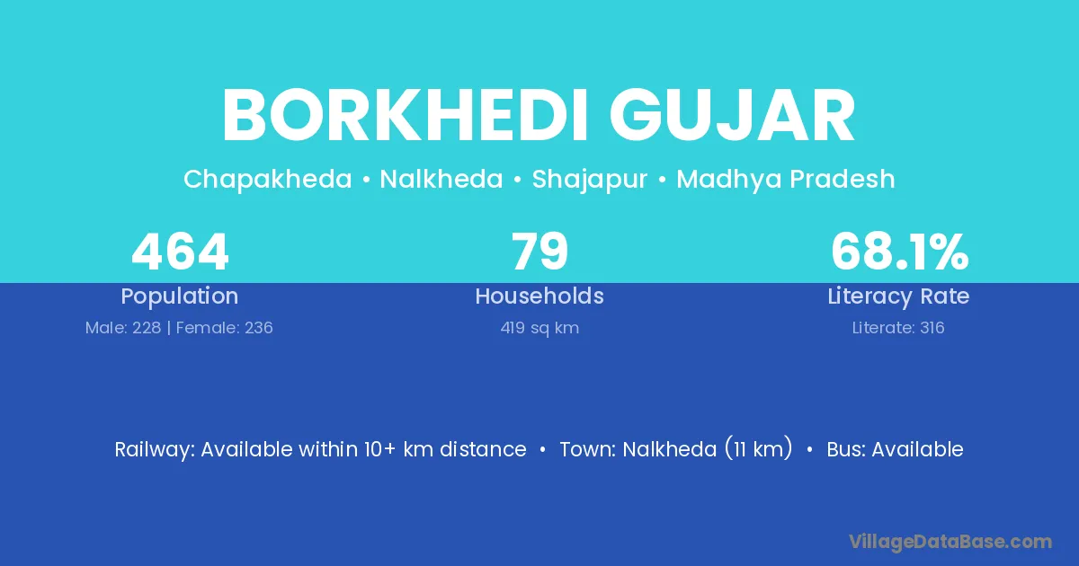 Nalkheda (11 km) is the nearest town to Borkhedi Gujar village for major economic activities and is located approximately 11 km away.