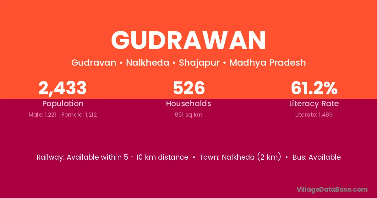 Nalkheda (2 km) is the nearest town to Gudrawan village for major economic activities and is located approximately 2 km away.