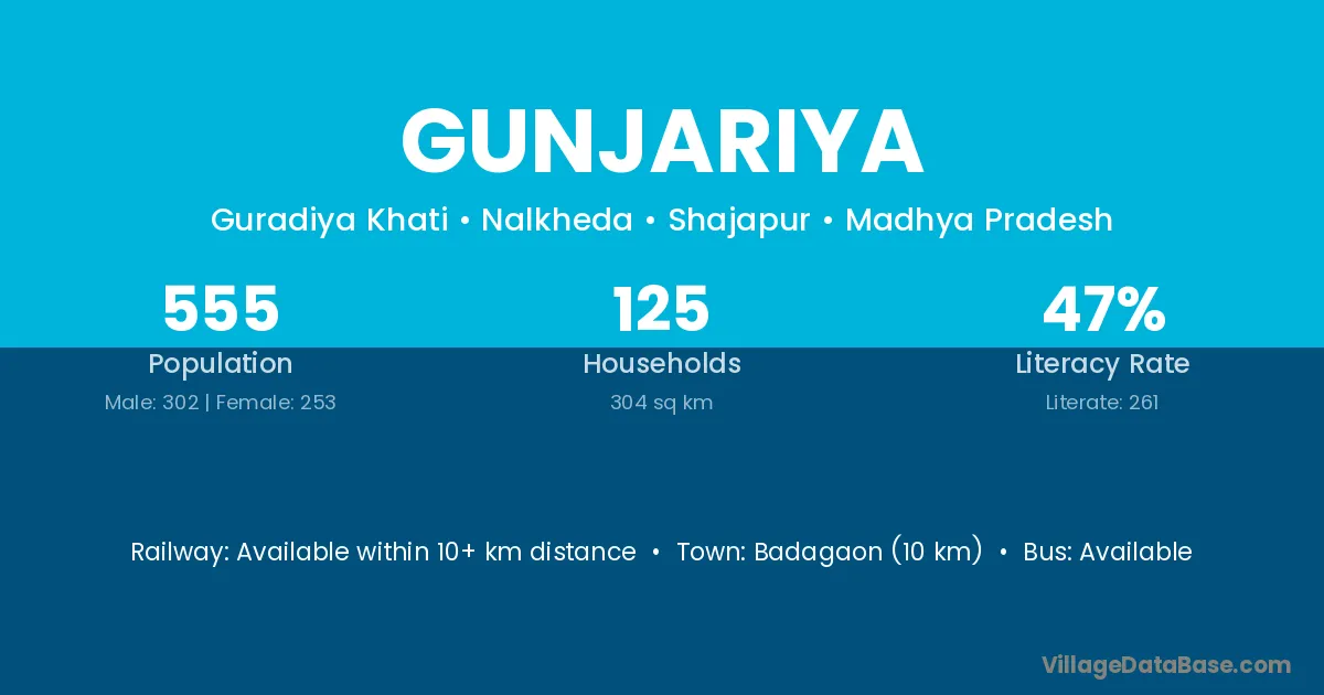 Gunjariya village has a total population of 555 people, of which 302 are males and 253 are females.