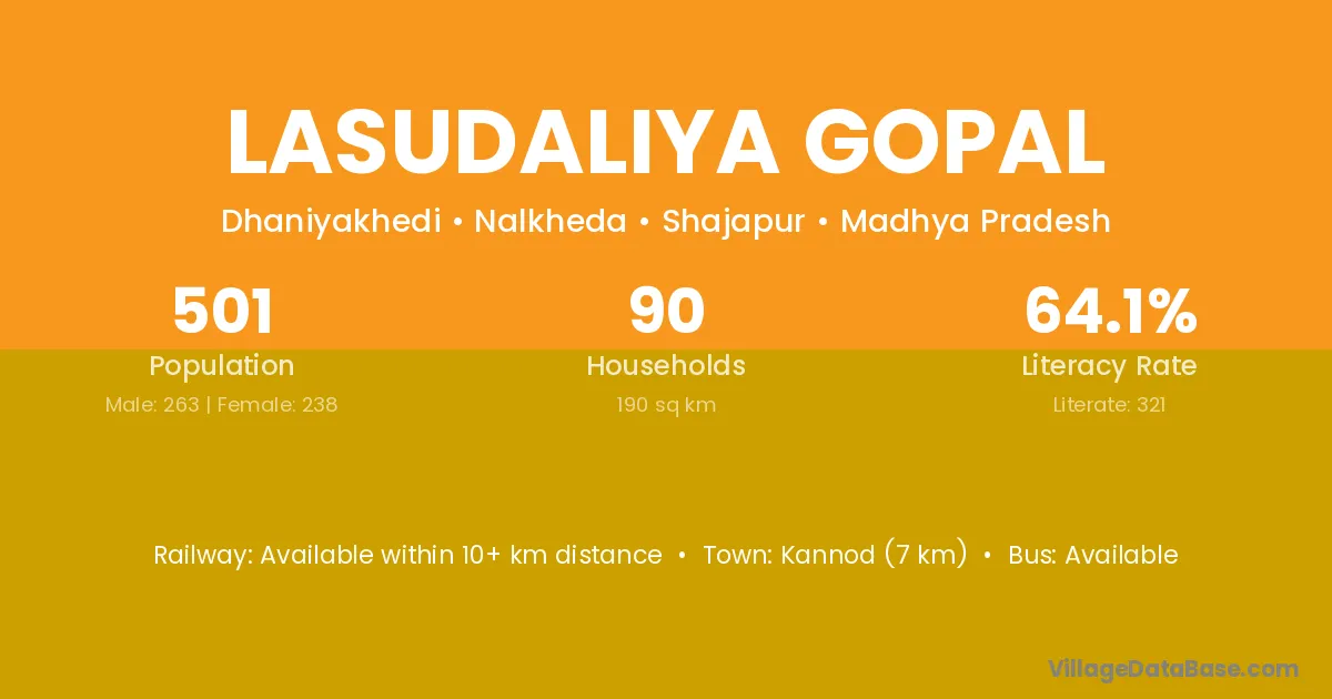 Kannod (7 km) is the nearest town to Lasudaliya Gopal village for major economic activities and is located approximately 7 km away.