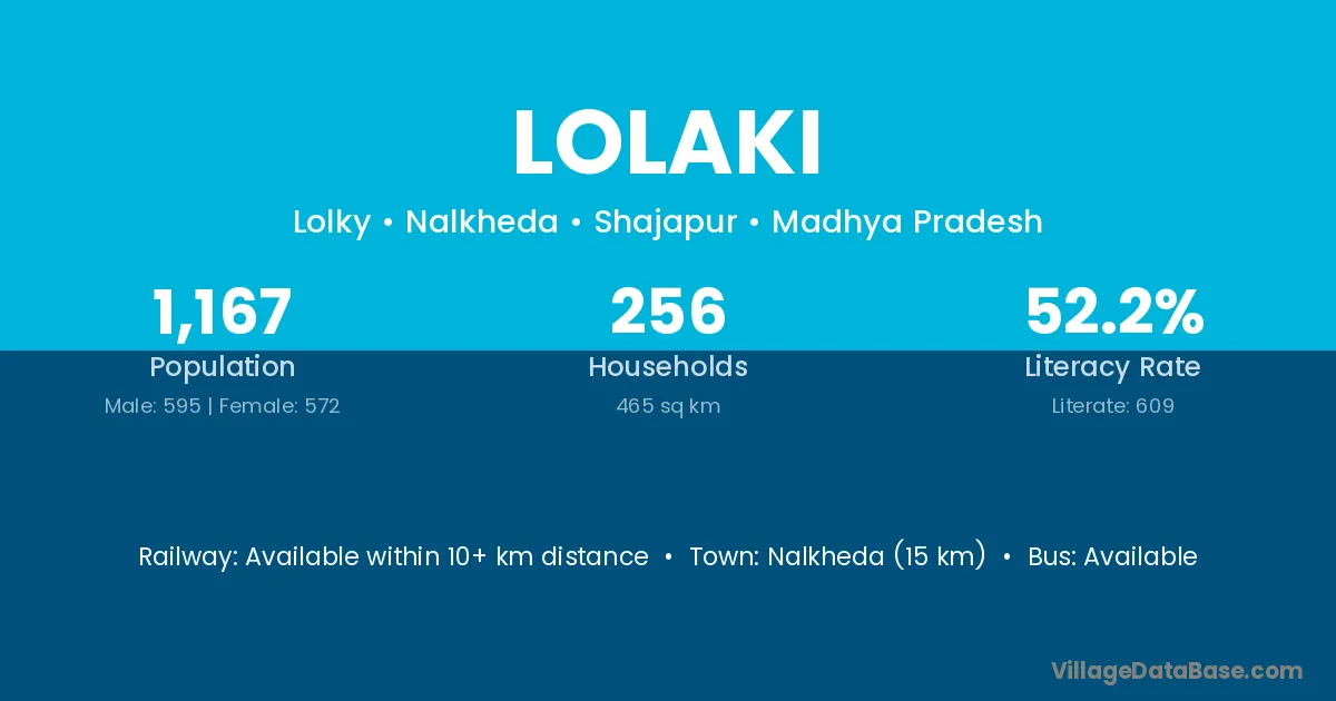 Nalkheda (15 km) is the nearest town to Lolaki village for major economic activities and is located approximately 15 km away.
