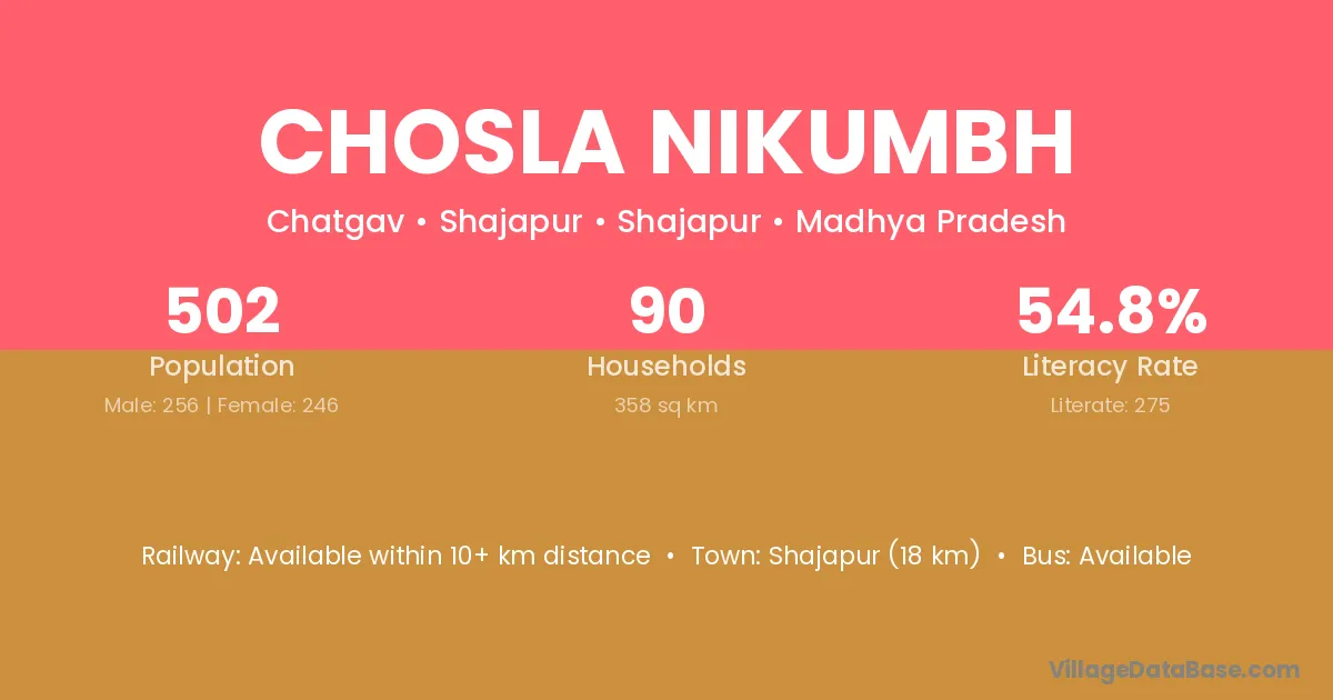 Shajapur (18 km) is the nearest town to Chosla Nikumbh village for major economic activities and is located approximately 18 km away.