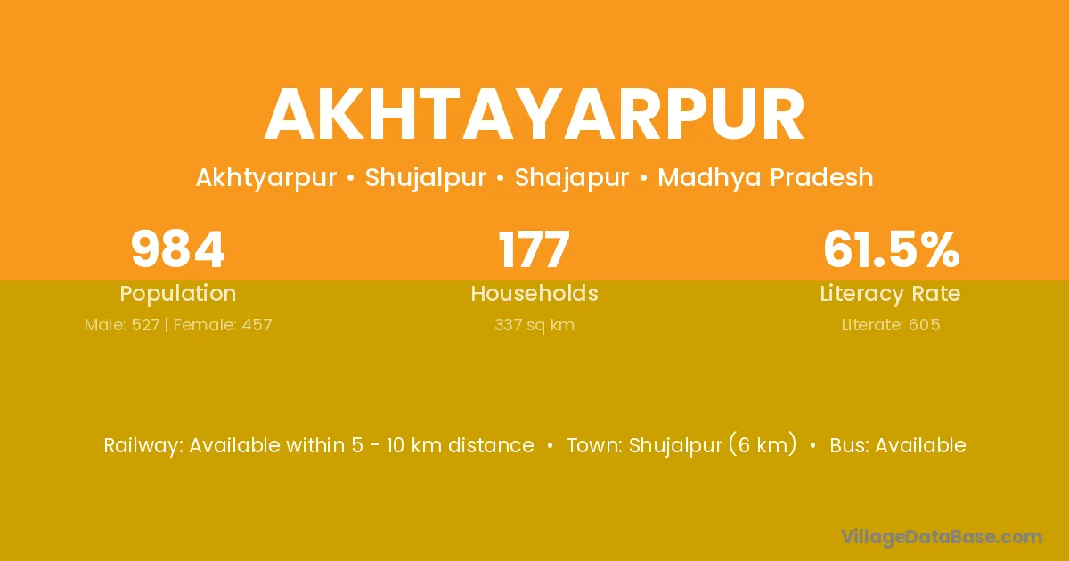 Shujalpur (6 km) is the nearest town to Akhtayarpur village for major economic activities and is located approximately 6 km away.