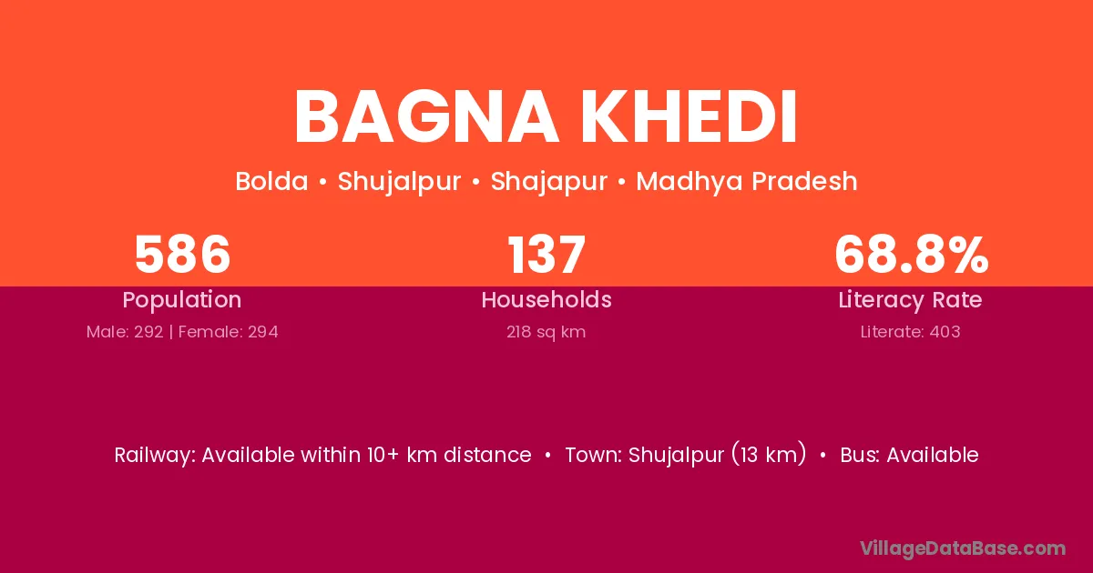 Bagna Khedi village has a total population of 586 people, of which 292 are males and 294 are females.