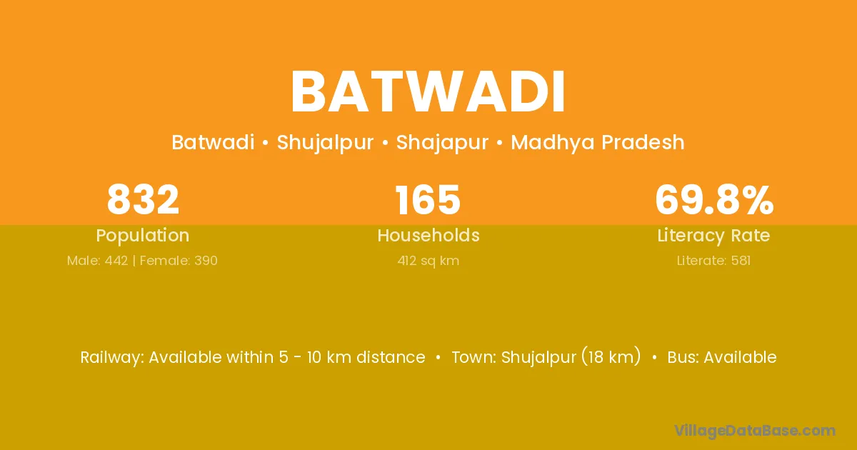 Shujalpur (18 km) is the nearest town to Batwadi village for major economic activities and is located approximately 18 km away.