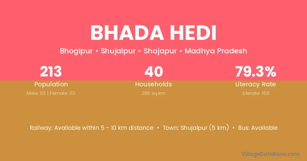 Shujalpur (5 km) is the nearest town to Bhada Hedi village for major economic activities and is located approximately 5 km away.