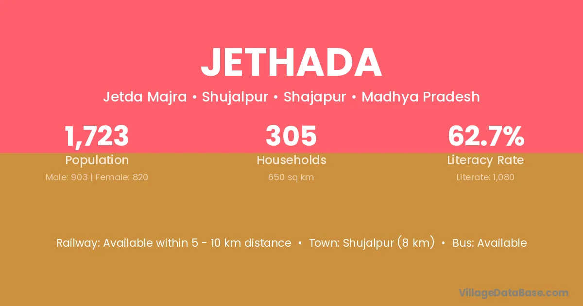 Shujalpur (8 km) is the nearest town to Jethada village for major economic activities and is located approximately 8 km away.