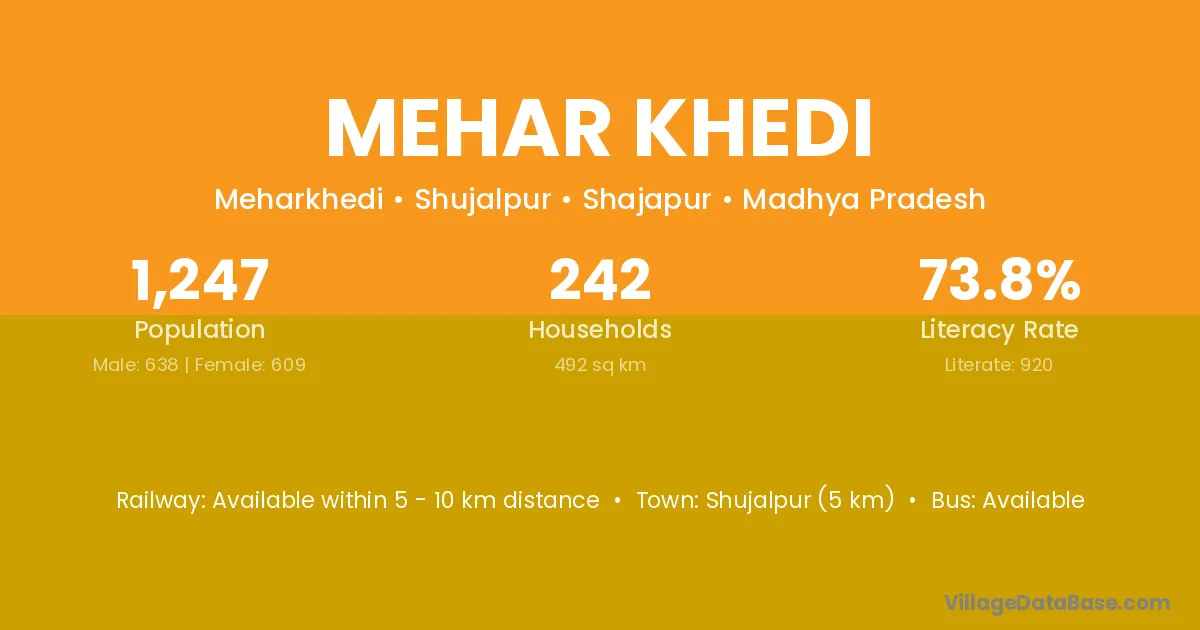 Mehar Khedi village has a total population of 1,247 people, of which 638 are males and 609 are females.