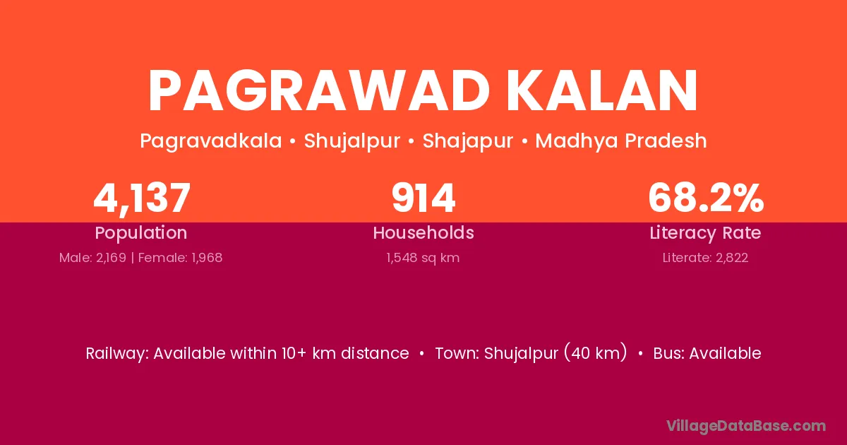Shujalpur (40 km) is the nearest town to Pagrawad Kalan village for major economic activities and is located approximately 40 km away.