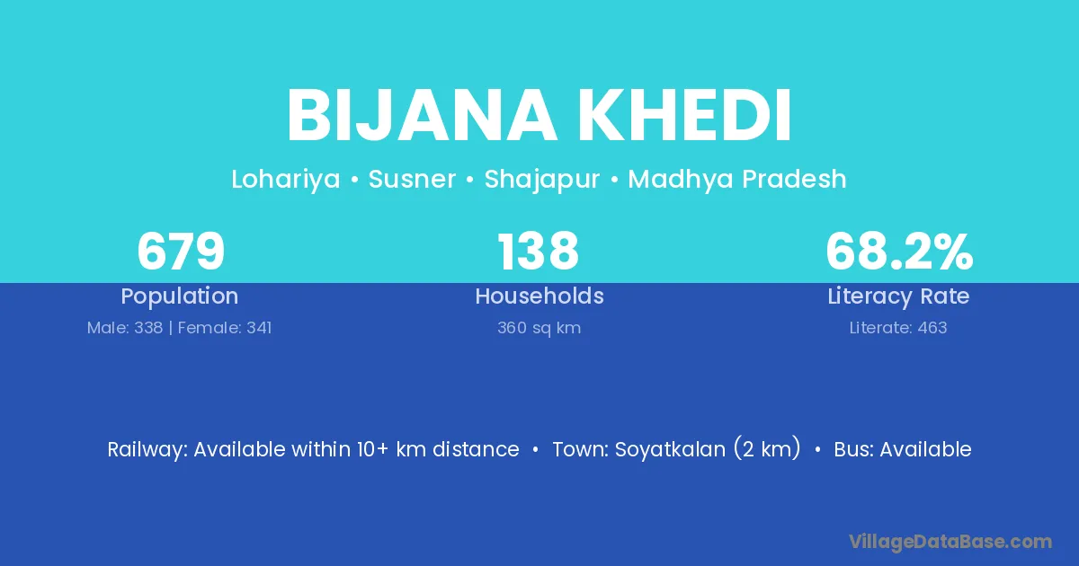 Bijana Khedi village has a total population of 679 people, of which 338 are males and 341 are females.