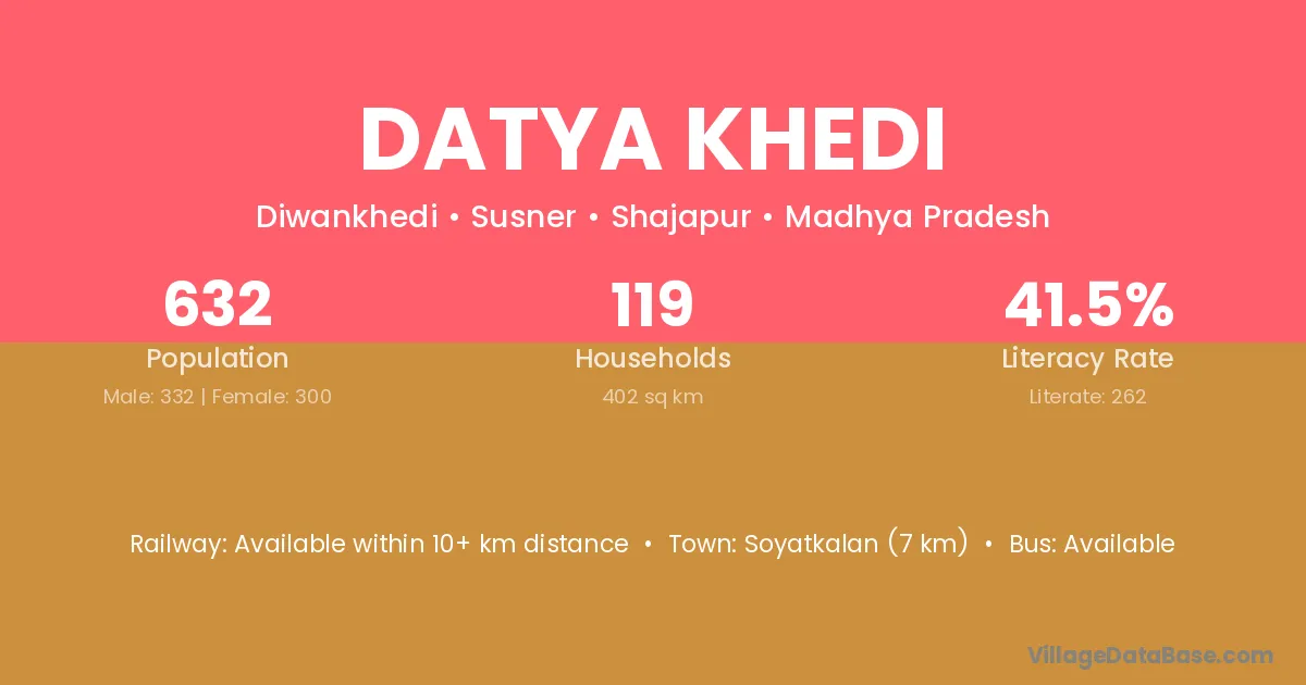 Datya Khedi village has a total population of 632 people, of which 332 are males and 300 are females.