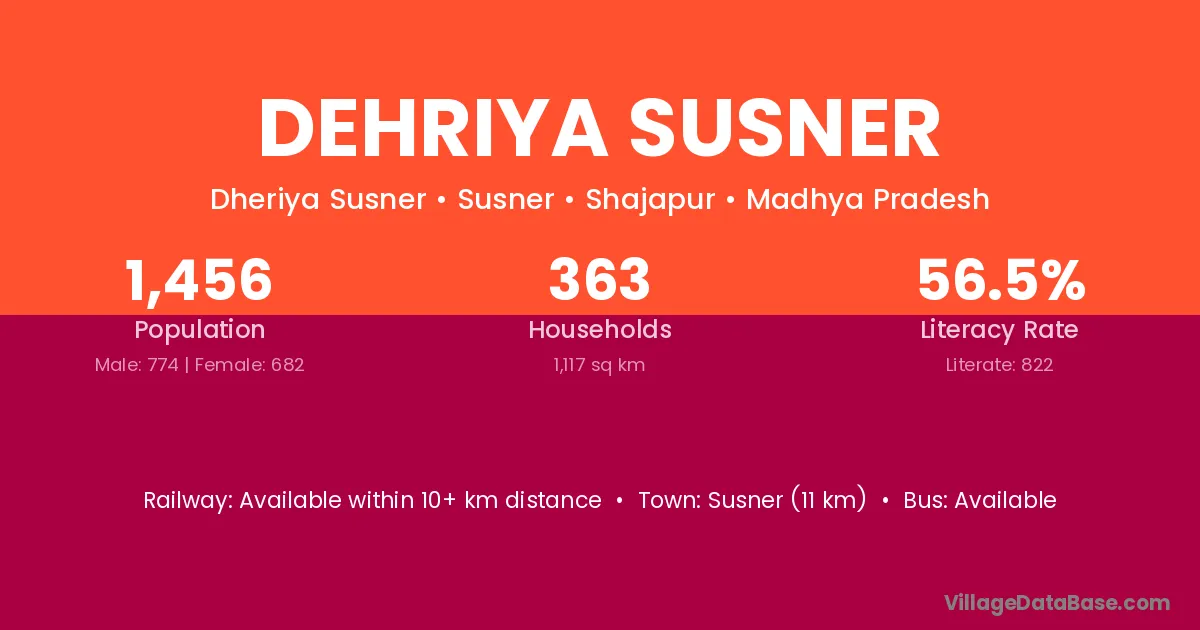 Dehriya Susner village has a total population of 1,456 people, of which 774 are males and 682 are females.