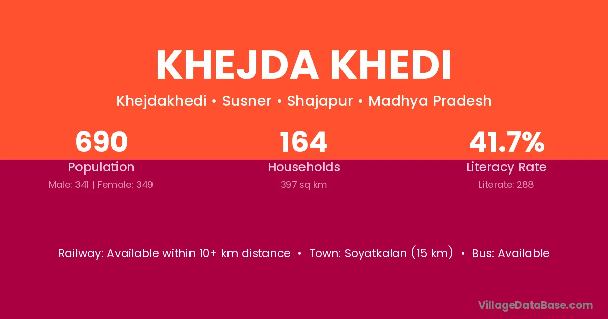 Khejda Khedi village has a total population of 690 people, of which 341 are males and 349 are females.
