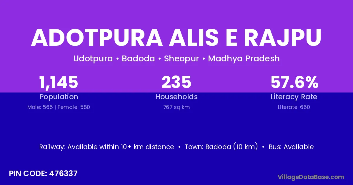 According to Census 2011 information, the village code of Adotpura Alis E Rajpu village is 476337.