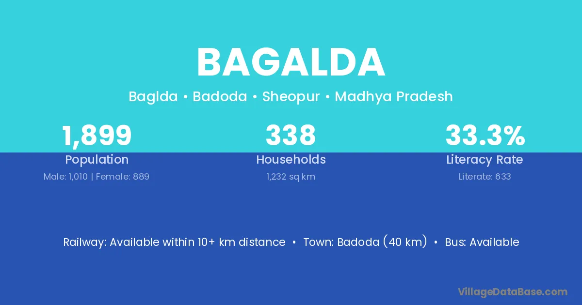 Badoda (40 km) is the nearest town to Bagalda village for major economic activities and is located approximately 40 km away.