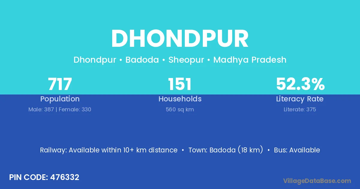 Badoda (18 km) is the nearest town to Dhondpur village for major economic activities and is located approximately 18 km away.