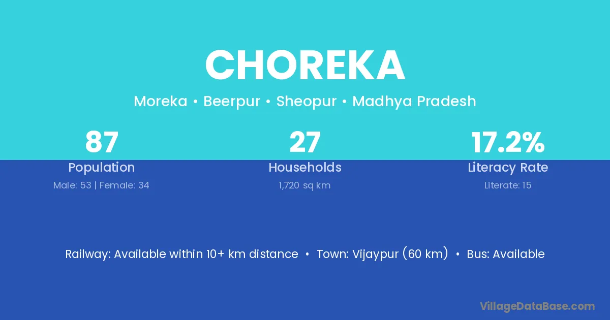 Vijaypur (60 km) is the nearest town to Choreka village for major economic activities and is located approximately 60 km away.