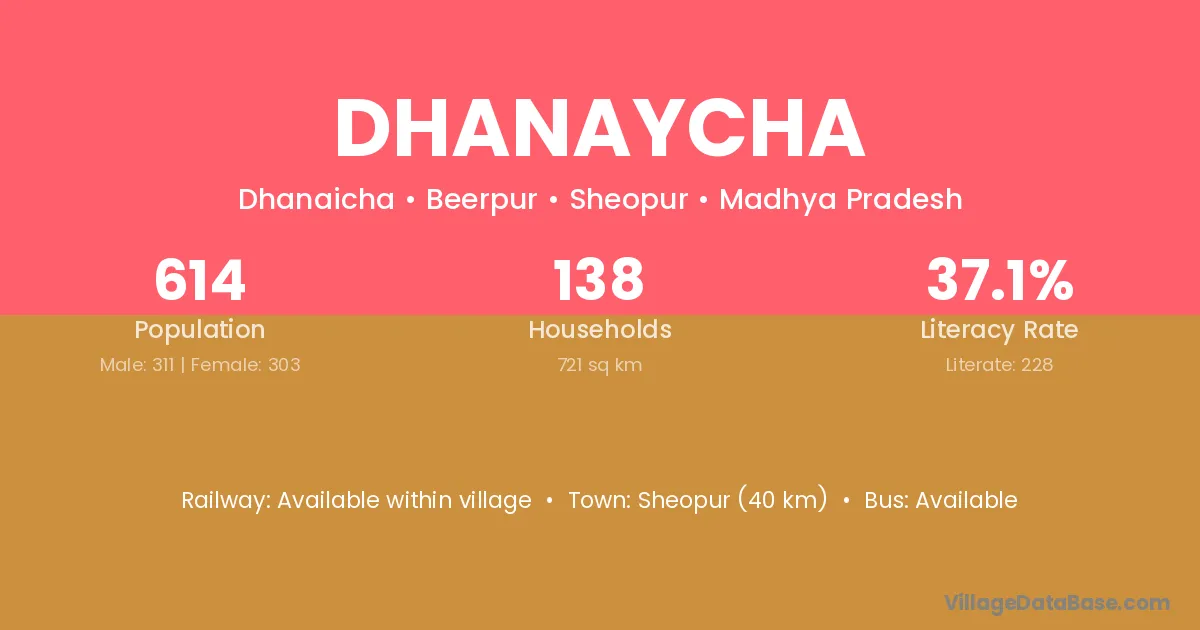 Sheopur (40 km) is the nearest town to Dhanaycha village for major economic activities and is located approximately 40 km away.