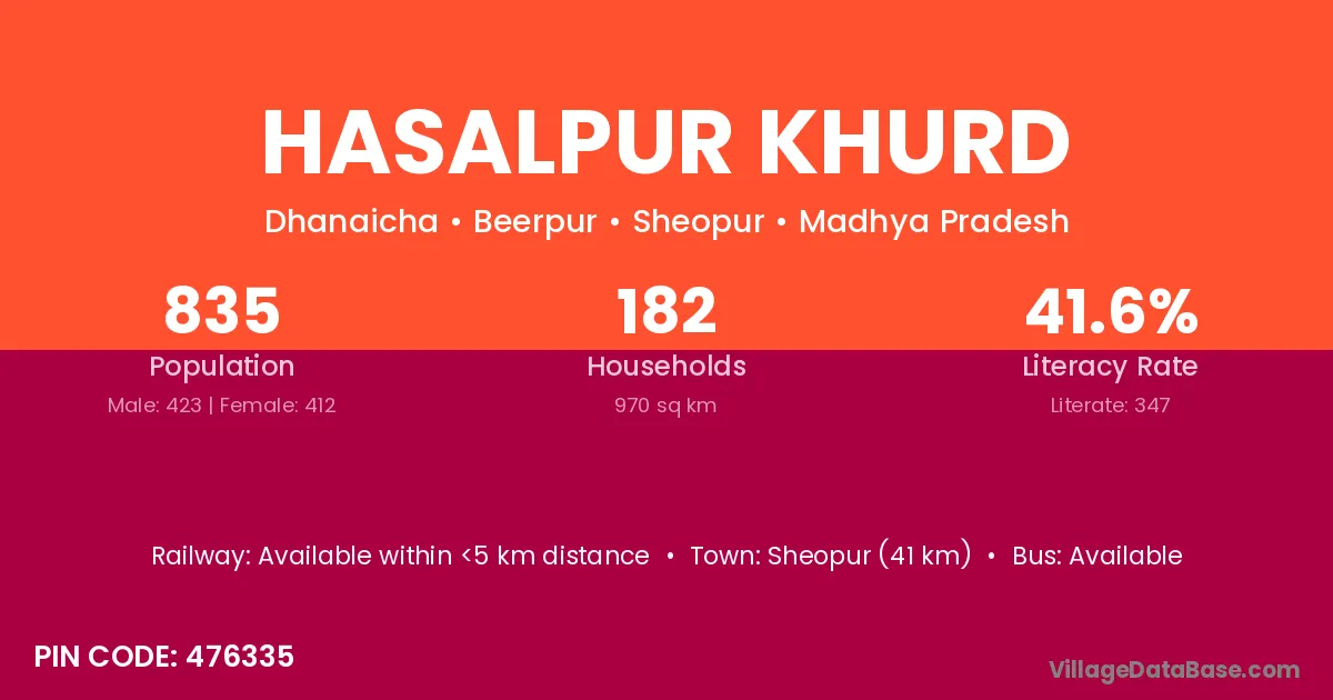 Sheopur (41 km) is the nearest town to Hasalpur Khurd village for major economic activities and is located approximately 41 km away.
