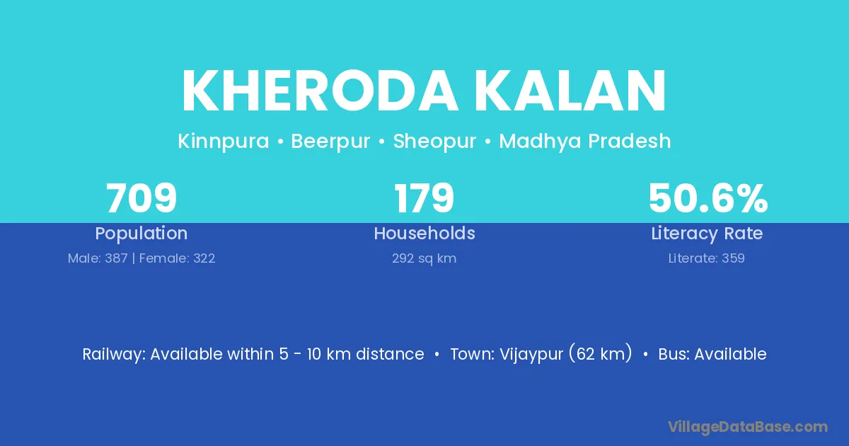 Vijaypur (62 km) is the nearest town to Kheroda Kalan village for major economic activities and is located approximately 62 km away.