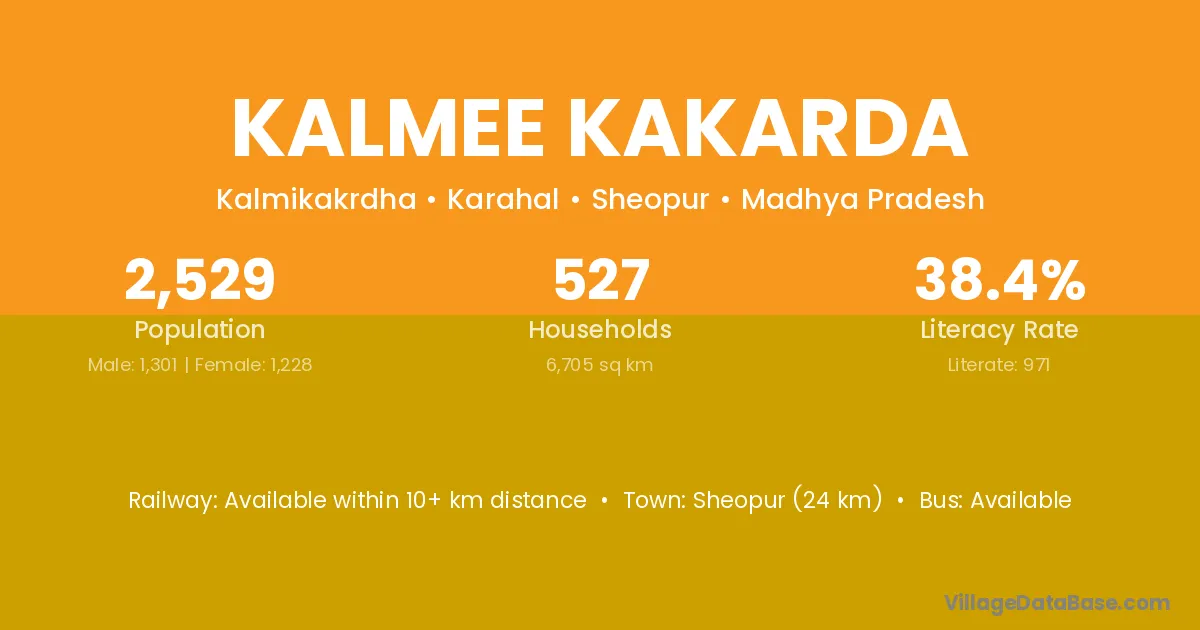 Sheopur (24 km) is the nearest town to Kalmee Kakarda village for major economic activities and is located approximately 24 km away.