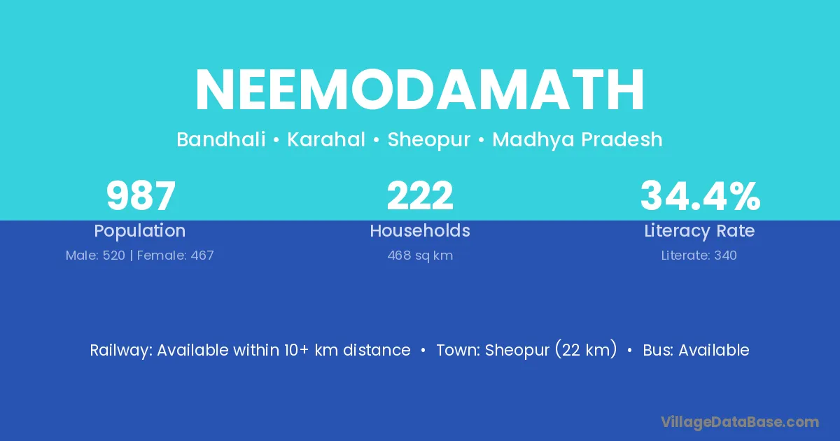 Sheopur (22 km) is the nearest town to Neemodamath village for major economic activities and is located approximately 22 km away.