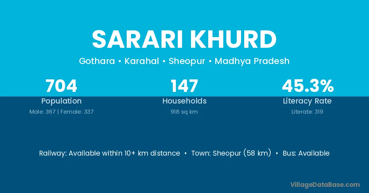 Sheopur (58 km) is the nearest town to Sarari Khurd village for major economic activities and is located approximately 58 km away.