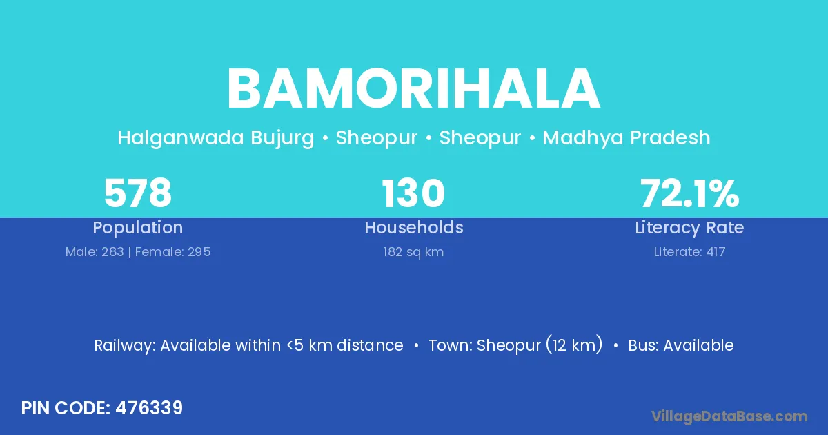 Sheopur (12 km) is the nearest town to Bamorihala village for major economic activities and is located approximately 12 km away.